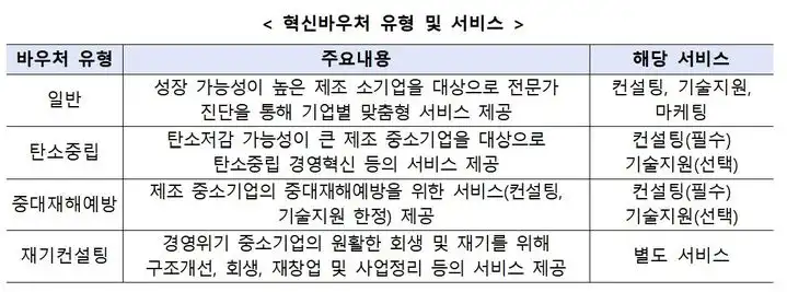 혁신바우처는 기업의 특성과 수요에 따라 일반형, 탄소중립형, 중대재해예방형, 재기컨설팅형 등 4개 유형으로 구성되며, 각 유형별로 3개 서비스(총 15개 프로그램)를 선택해 바우처 방식으로 지원받을 수 있다. 내년도 전체 예산은 올해보다 38억원 늘어난 652억원으로, 약 2700개 중소기업이 혜택을 받을 전망이다.