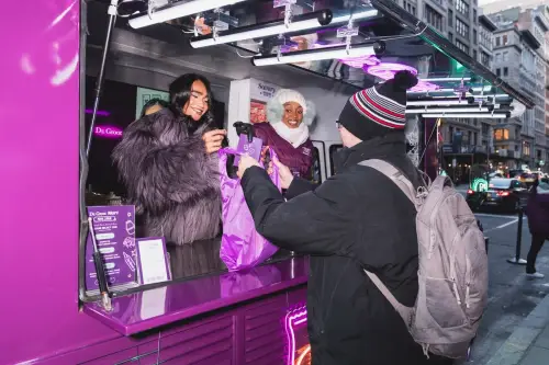 닥터그루트 미국 뉴욕 팝업 트럭 행사에서 인플루언서 브랫맨 락이 참여고객들에게 제품을 증정하는 모습